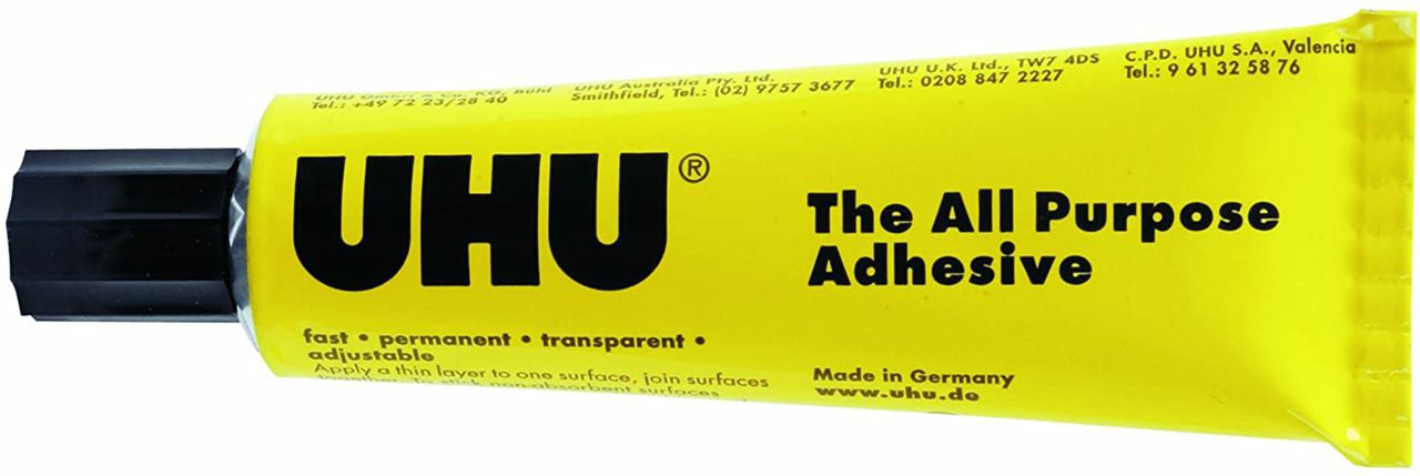 UHU All Purpose Adhesive, is a fast, crystal-clear universal adhesive. For universal applications at home, in the office, for modelling, at school and for crafts. Glues many materials rapidly and durably. Its adhesive bond remains temporarily correctable and it does not wrinkle paper.