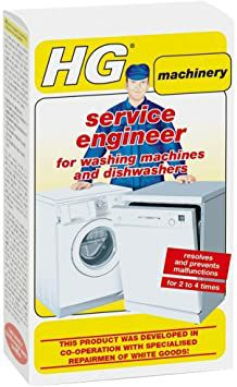 The machine cleaner HG service engineer for washing machines and dishwashers prevents and solves faults in a washing machine or dishwasher. The use of the machine cleaner prevents filters, floats, drain pipes and other inaccessible parts from malfunctioning due to deposits in the machine.