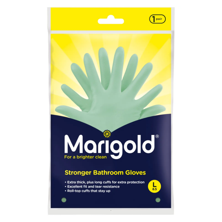 Marigold Longer Bathroom Rubber��Gloves have an extra-comfy cotton lining, making them the perfect addition to any household cleaning kit.��Marigold Longer Bathroom Gloves are perfect for those splashy jobs. The longer roll-top cuffs and slimmer wrists give a perfect fit and protect from bathroom cleaners, bleach and disinfectants. What��Ts more, they can be recycled with TerraCycle��.