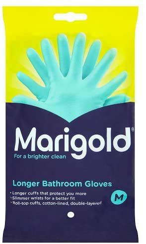 Double layered coating protects against most bathroom cleaners and disinfectants. Roll top extra long cuffs reduce the amount of water getting onto the skin and inside the glove. Fitted wrists provide extra grip and a better fit. Cotton lined for extra comfort. Contains natural latex. Choose from sizes Medium or Large.