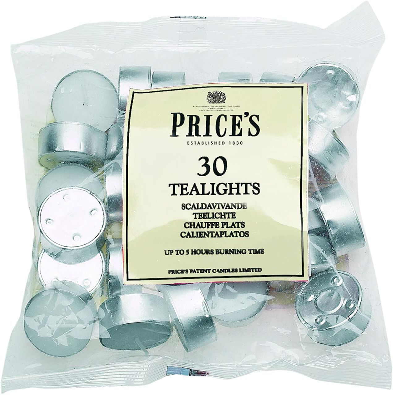 Price’s pack of 30 high quality, unscented, white wax tealights give up to 5 hours of burn time.