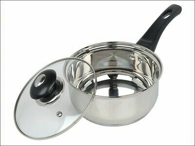 Stainless steel saucepan with glass lid, available in a range of sizes and suitable for use with metal utensils